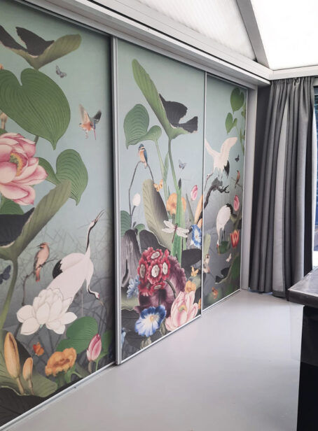 Voor Wendy uit Eindhoven hebben we alle afbeeldingen rondom de piano geplaatst en ook rekening gehouden met de deur. Maar je kunt ook jouw favoriete bloem mee laten printen. Of vogel. Of we passen een kleur aan. Hierin gaan we best ver, dus vraag het vooral en dan kijken wij wat we voor je kunnen doen. Deze aanpassingen zijn bij de prijs inbegrepen.