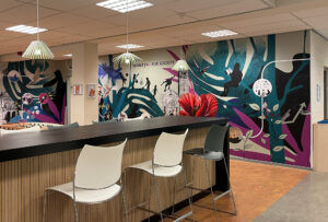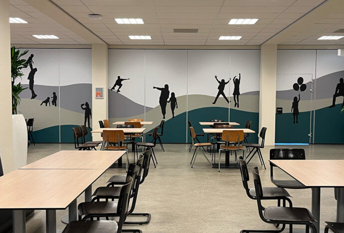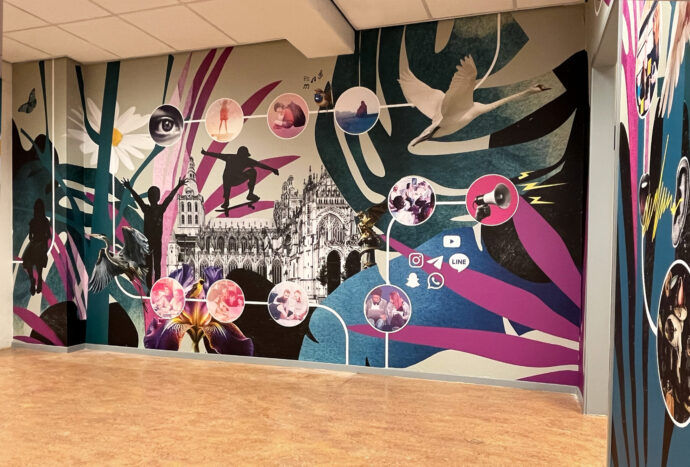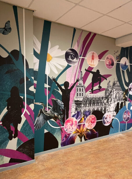 Voor Fontys Pedagogiek en de Pabo in Den Bosch ontwierp ik een serie muurvisuals op maat. De entree is nu gevuld met een krachtig beeldverhaal waarin onderwijs, stad en natuur samenkomen. De visuals laten zien waar de opleidingen voor staan: leren, ontwikkelen en verbinden. Ik combineerde foto’s, illustraties en grafische elementen tot een geheel dat de identiteit van Fontys weerspiegelt. Zo worden bezoekers bij binnenkomst meteen omringd door een inspirerende omgeving. Naast de onderwijsthema’s zijn ook kenmerkende gebouwen van Den Bosch verwerkt in het ontwerp. Het resultaat zijn unieke muurprints op maat die niet alleen de ruimte mooier maken maar ook betekenis toevoegt.