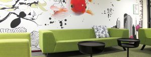 Omdat het altijd druk is in de gangen is vinylbehang een perfect materiaal om mee te werken dus daar zijn de ontwerpen voor de openbare ruimtes op geprint.In de vergaderruimtes is er veelal gebruik gemaakt van textielframes met het ontwerp geprint op doek. Ook deze frames zijn op maat te leveren en geven de ruimte net wat meer cachet. Tevens wordt het geluid enigszins gedempt vanwege de stof in het textielframe.