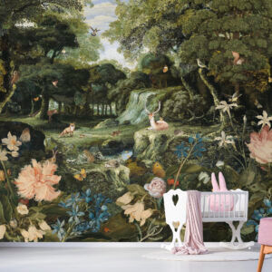 In een klein dorpje, omringd door groene heuvels en kronkelende rivieren, stond een huis met een bijzondere kamer. Deze kamer was niet zomaar een kamer; het was een poort naar een magische wereld. De muren waren bedekt met prachtig behang met dieren, dat een sprookjesachtig bos toonde met hertjes, vlinders, een haas en prachtige bloemen.