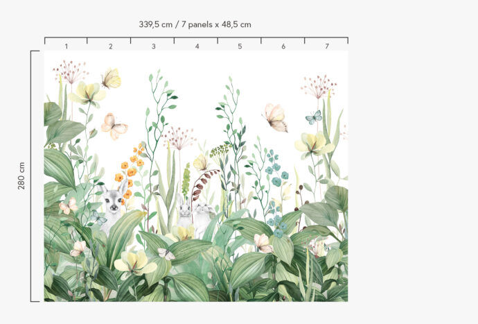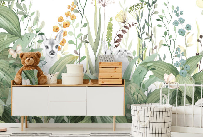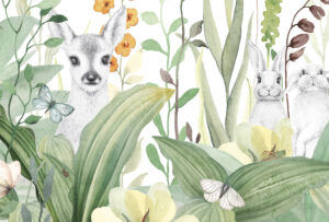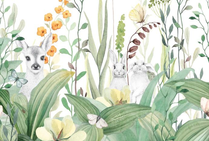 Heb je de schattige dieren al gespot die erin verstopt zitten? Het ontdekken van de kleine konijntjes en het hertje tussen de bloemen en bladeren is vast een leuke verassing voor je kind. Deze dierlijke elementen zijn subtiel geïntegreerd in het ontwerp, waardoor ze niet overheersen maar wel bijdragen aan het verhaal en de magie van het behang.